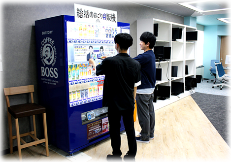 さらに、執務室エリアには『総括のおごり自販機』があり、誰かと一緒に社員証を「ピッ」とかざすだけで、好きな飲み物をゲットできます。(写真からも、繋がりを持てるいい機会になります!)