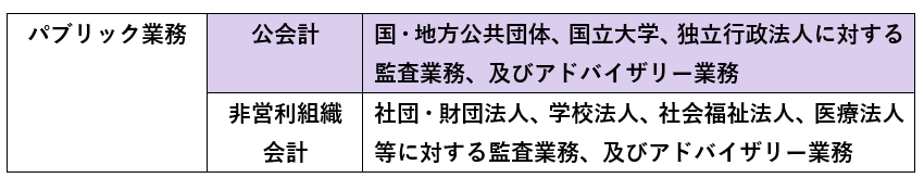 太陽では、官公庁・非営利法人等に対しての監査業務・アドバイザリー業務のことを『パブリック業務』と呼び、その中の国・地方公共団体へ提供する業務を『公会計業務』と呼んでいます。詳細な区分けは以下のとおりです。