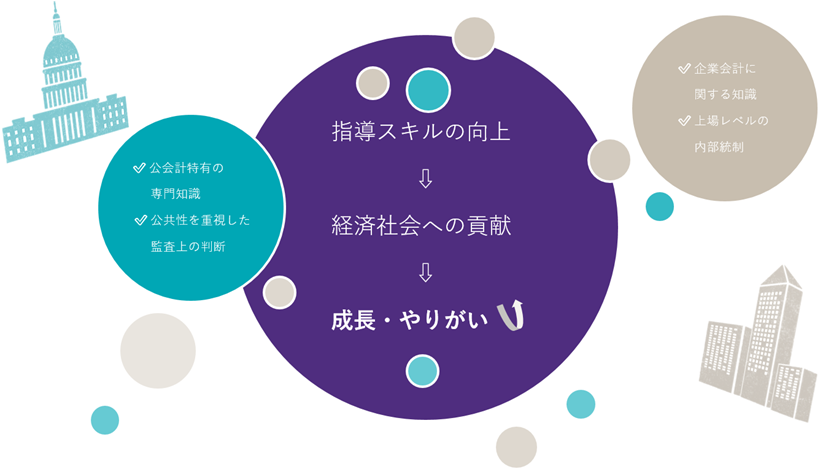 また、前述のように、一般企業の監査業務を通じて得た経験を公会計業務に活かすことができるので、一般企業の監査業務をするときの成長実感も、より大きいものとなります。