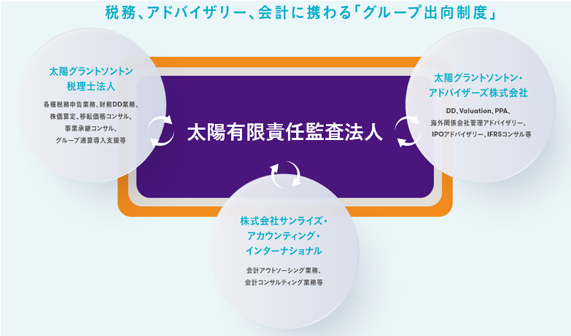 この制度は、太陽の会計、税務、アドバイザリーなどのグループ会社に出向して業務を行うことで監査以外の知見を磨くことができるものです。