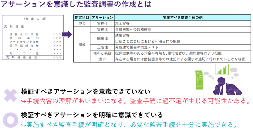 監査においては、担当する科目に対して、複数のアサーションを総合的に判断していく必要があり、アサーションごとに適合する手続も異なってきます。そのため、今は「この手続は実在性のアサーションを検討するものだ」というように、アサーションを意識して業務に取り組むことに注力しています。