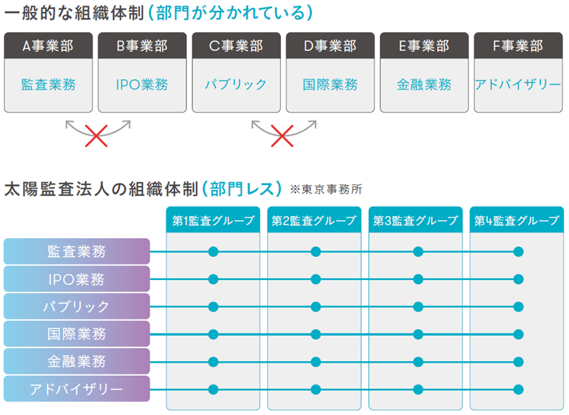 太陽は部門レスを採用しているため、業務やクライアントの業種が固定されておらず、どのグループに所属していても、多様な業務を同時期に実施し様々な経験を積むことができます。