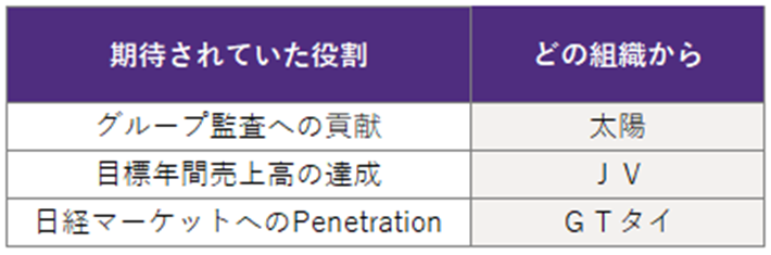 Boardメンバーである太陽の山田総括とGTタイのCEOに対して業績報告・事業計画の説明(見直しも含む)を行いますが、結果(年間目標売上高の達成)を出すために、どのようなターゲットに向かってどのように動いていくべきか、事業計画としてどのようなプランを考えて、どのような行動をしたのかについて、都度報告し、毎回貴重なご意見・アドバイスを(みっちりと)もらいました。